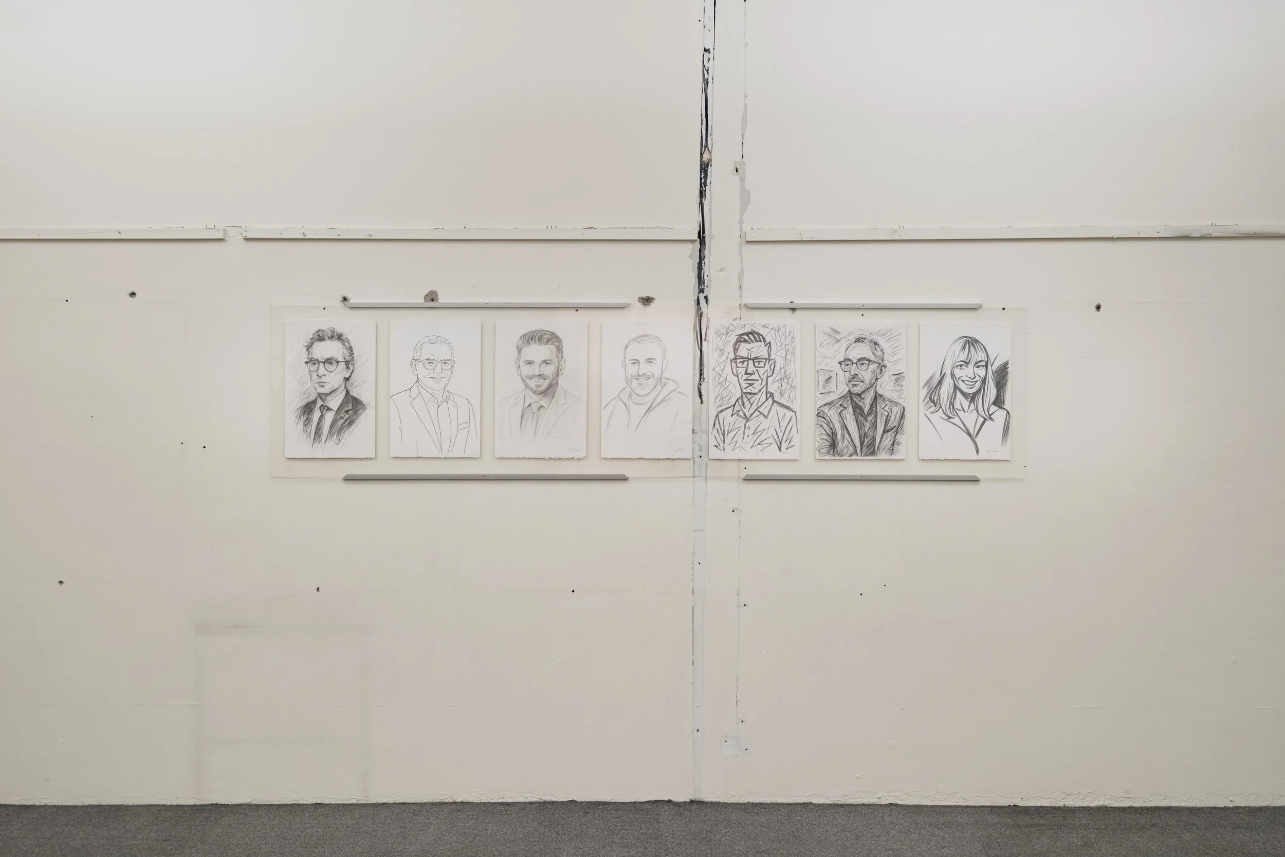Some portraits, 2025, Graphite on paper, clear acrylic, aluminium channel, 73 x 316cm, Photo courtesy: 1workroom9 and C Hillhouse